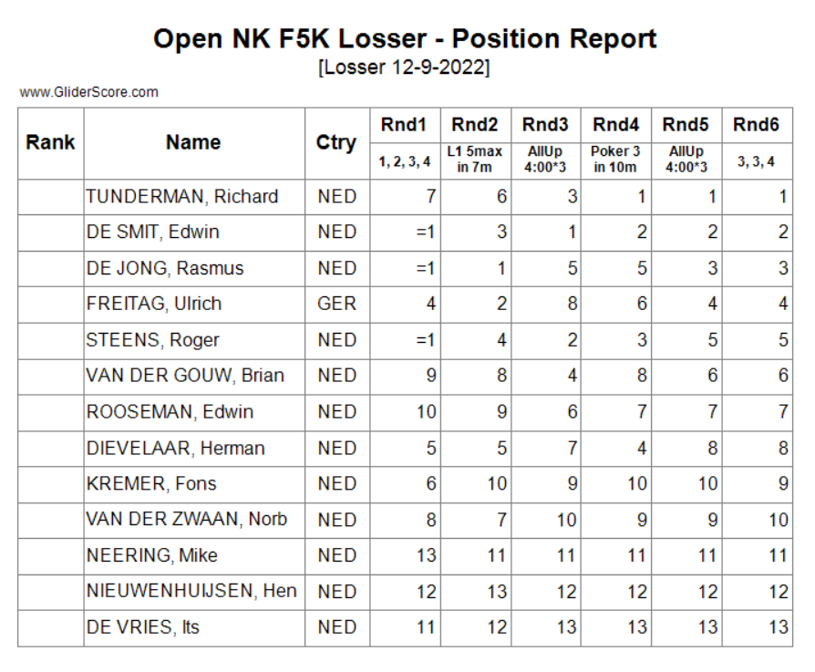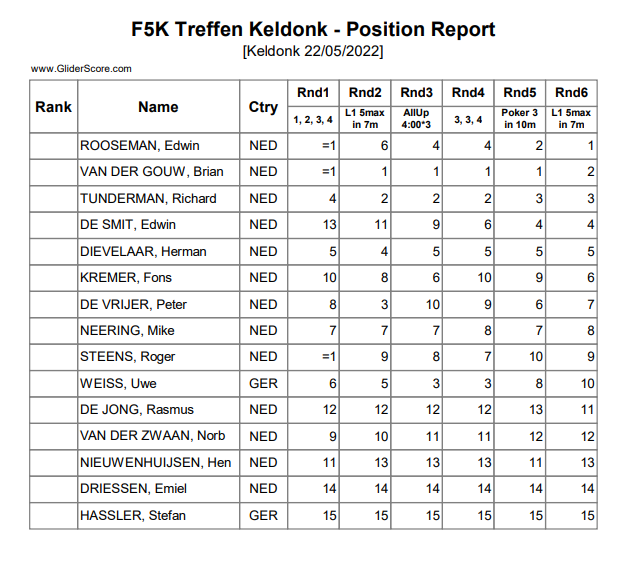 Eigenlijk hebben we zondag de eerste “echte” F5K wedstrijd gezien, zoals we deze oorspronkelijk bedoeld hadden: een mix van F3K (meertaken vliegen), F5J (het belonen van lager starten als dat kan) en F3J (timen van de landing bij doorstart taken). Moedig vliegen werd beloond: kijk maar eens naar de starthoogtes van de toppers. Je moet toch echt wel overtuigd zijn van de thermiek om 4 keer te starten op een hoogte van circa 30 meter om dan alsnog 4 minuten vol te vliegen (Edwin de Smit, taak 1-2-3-4) of om bij Poker “All-in” te roepen en met 1 vlucht van 9,59 het optimale resultaat te boeken (Richard Tunderman), waarbij anderen voor de veilige route kozen van 3 vluchten en dus veel kostbare punten lieten liggen.